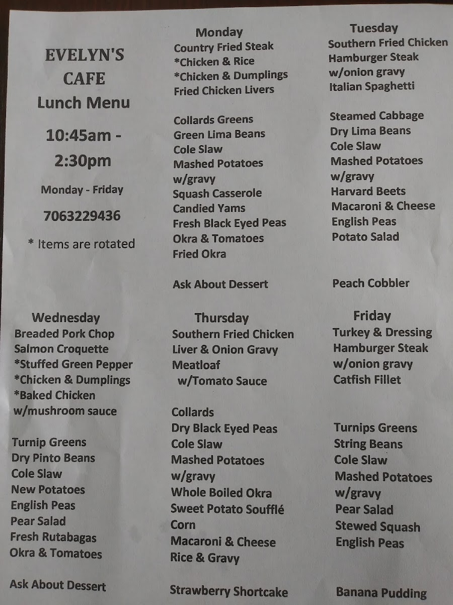 Located at 2601 Hamilton Rd, Columbus, GA, Evelyn's Cafe is a cherished gem that embodies the warmth of home-cooked meals and the nostalgia of visiting Grandma's kitchen. This charming cafe captures the essence of traditional Southern cuisine, offering a menu featuring hearty breakfasts and satisfying lunches that keep the locals returning for more.